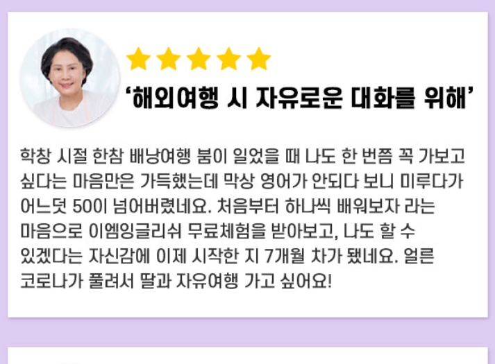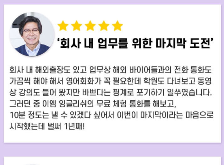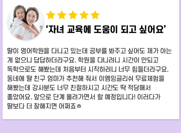 그래서 인터넷으로 검색하다가 이엠잉글리쉬를 발견하고, 후기들이 꽤 괜찮아 보여서 도전해보기로 결정했죠. 결과는 정말 놀랍게도 제 의구심을 완죤히 날려버렸어요.