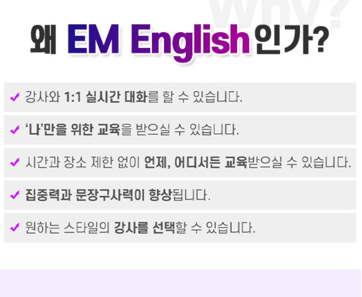 영어 회화 초보자부터 해외 여행, 해외 출장, 자기 개발 등 영어 회화가 필요한 모든 분들에게 EM 이엠잉글리쉬는 큰 도움이 될 거예요. 현재 초보 영어 전화 수업 무로 경험 이밴트를 진행 중이니, 이 기회를 놓치지 마세요!