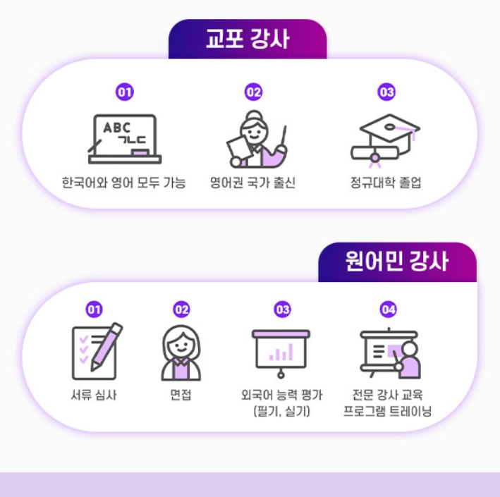 - 교포 강사: 한국어와 영어 모두 가능하며, 영어 수업이 어려운 분들 또는 기본 생활 회화, 여행 영어, 초급 비즈니스 영어를 배우려는 분들에게 적합해요.